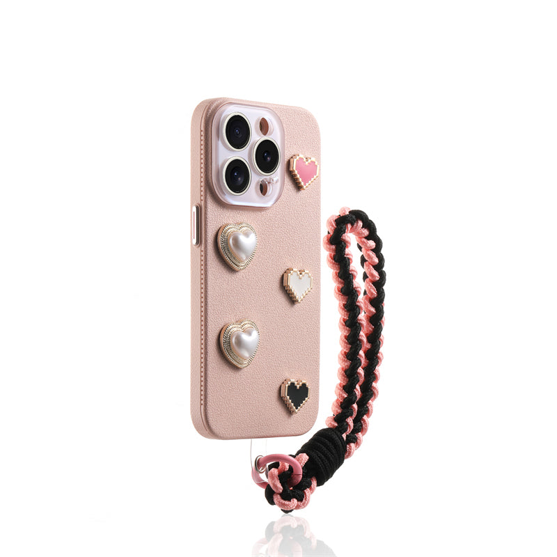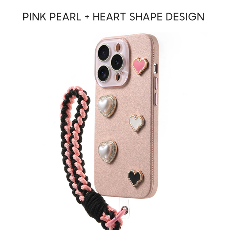 iPhone Lanyard Series | 3D Pearl Heart Genuine Leather Phone Case
