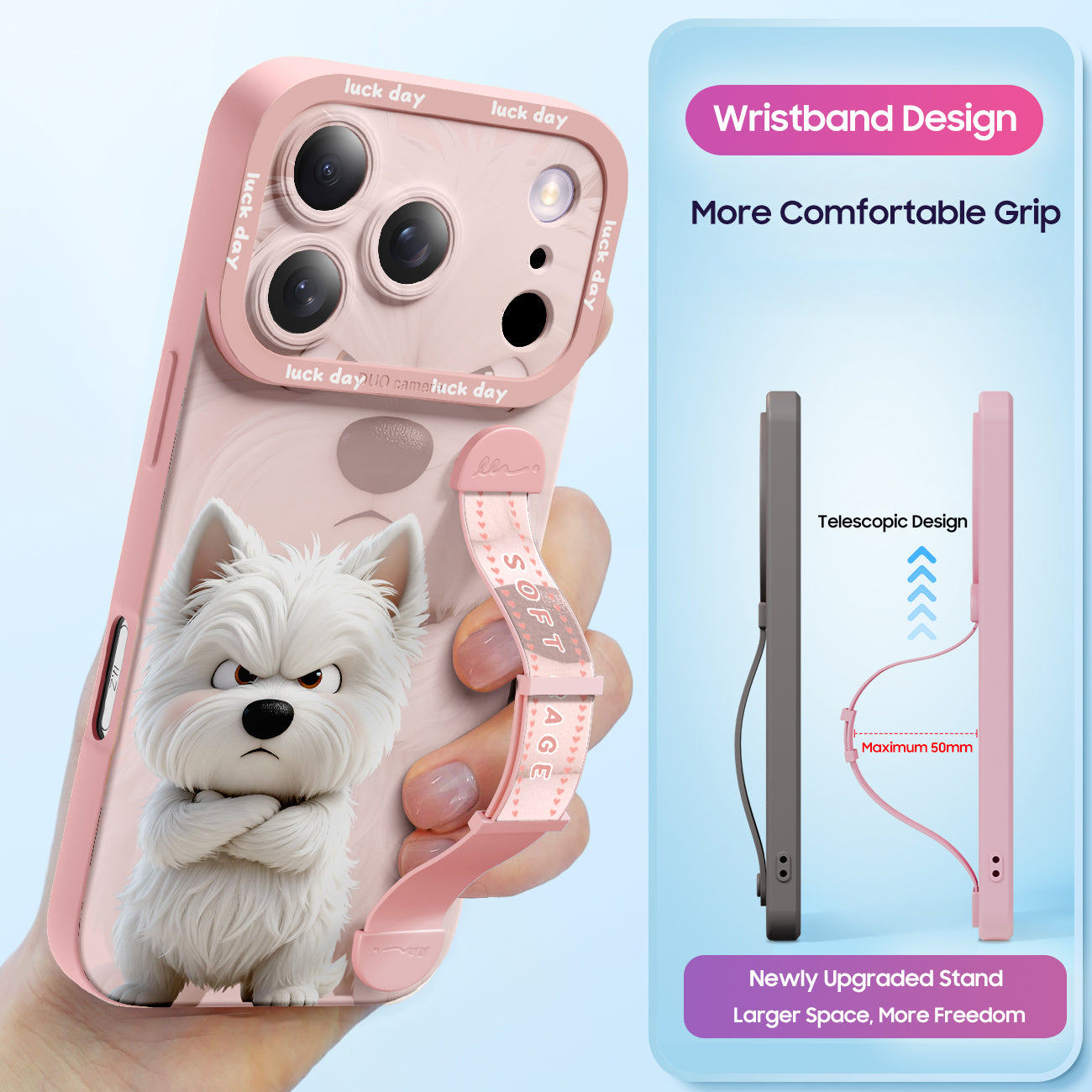 Soporte integrado para correa de muñeca ajustable y flexible. Ideal para usar en cualquier lugar. Libera tus manos cuando miras programas, videollamadas u otros vídeos en tu teléfono.