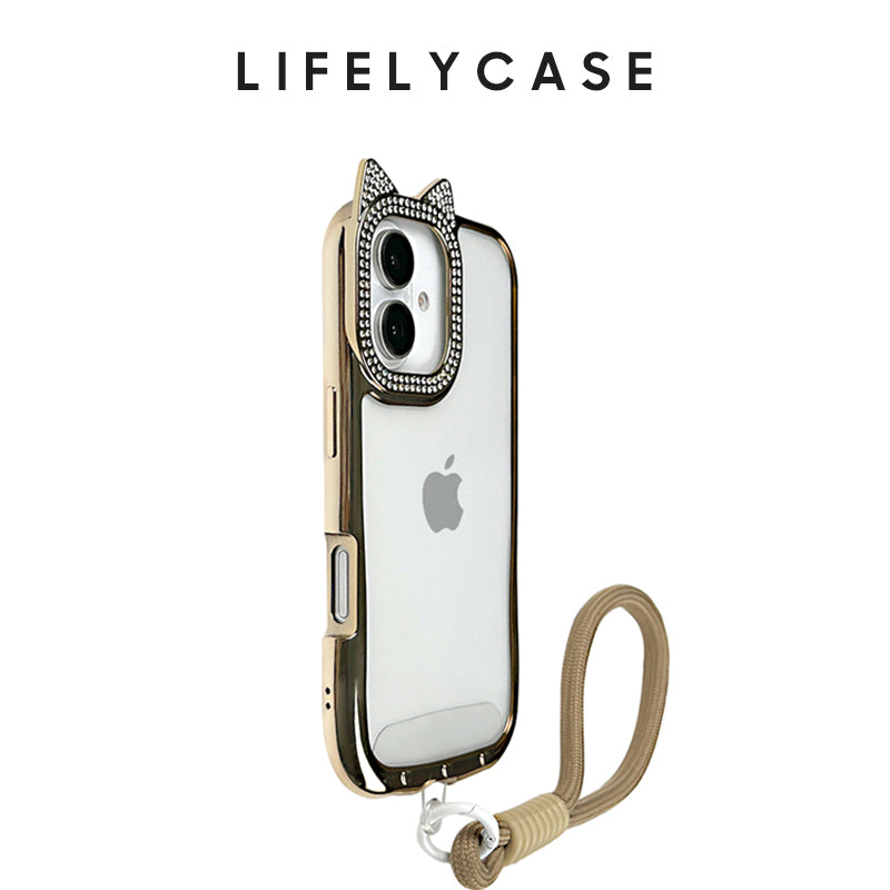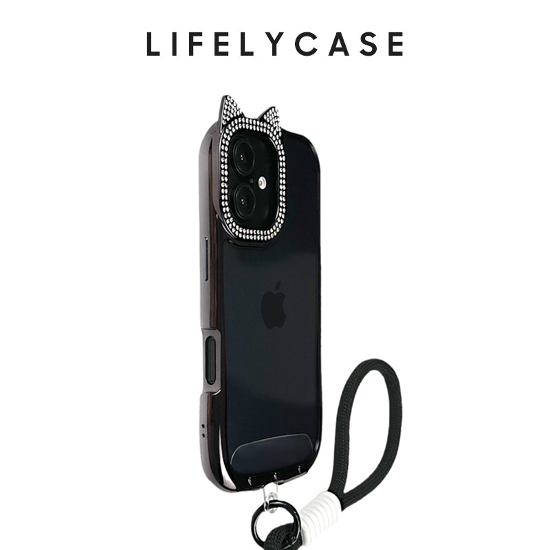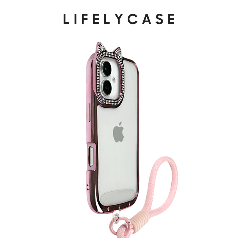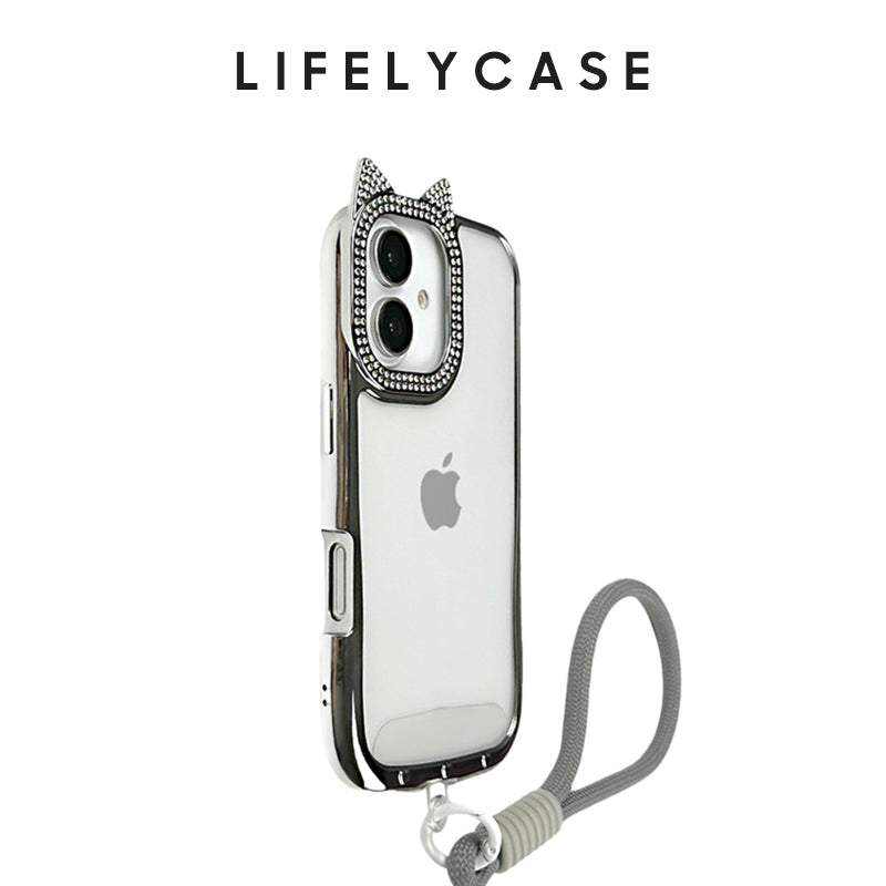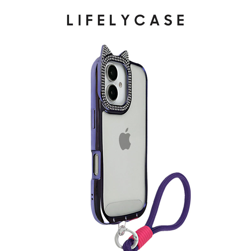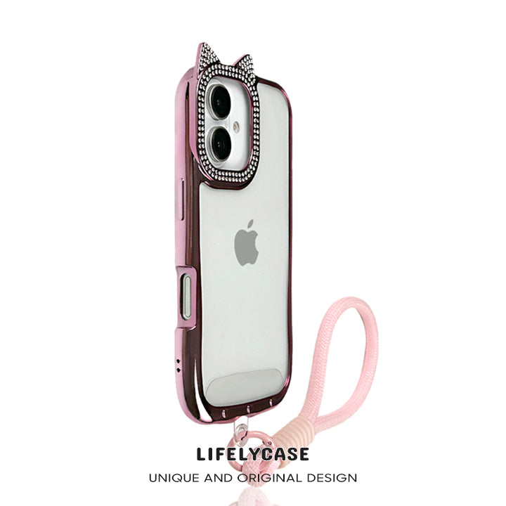 iPhone Lanyard Series | Diamond-Studded Cat Ear Design Electroplated Silicone Phone Case